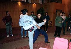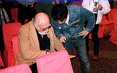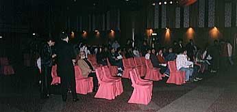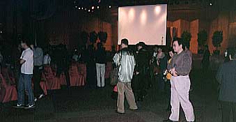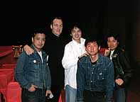 | ゲスト ホテルで昼食後、いよいよ上映会です。G.O.Dの竹田さん、MEDIA ASIAのベイ・ローガンさんが司会進行を勤められました。 ちょっとしたトークの中でベイ氏が「リーとトンワイ(ラオ少年)の会話を暗記していて再現できる人はいないか?」の問いに、 我らが熊の爪さんが挙手!!舞台に上がり、リーのセリフを喋らせてくれるのかと思えば、リーの役はベイ氏(なんじゃそら!)。 すっかりリーのつもりで舞台に上がった熊の爪さんは「Let me think」という一言しか喋らせてもらえず、延々とベイ氏は オーバージェスチャーでリーのセリフを真似していました(間違ってたゾ!)。 でもお礼にということでジョン・ベン氏のサイン入り未公開写真を進呈されたのでした。 (でもジョン・ベンは昨晩さんざん写真もとり握手もしたゾ!)。 また、残念ながら予定されていた方々は登場せず(元華の話が聞きたかったぁ)。 ただ、「ドラ道」のボスであるジョン・ベン氏、同作で「マンマミーヤッ!」と叫ぶ人ではなく(汗)、リーの後ろから迫るが、 ヌンチャク一振りですぐやられる役のアンディス・ネルソン氏、ルビー・チョウの息子(!)であり俳優のデビッド・レオン氏が 紹介され、逸話を公開してくれました。 |